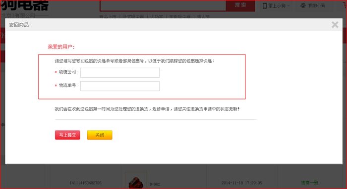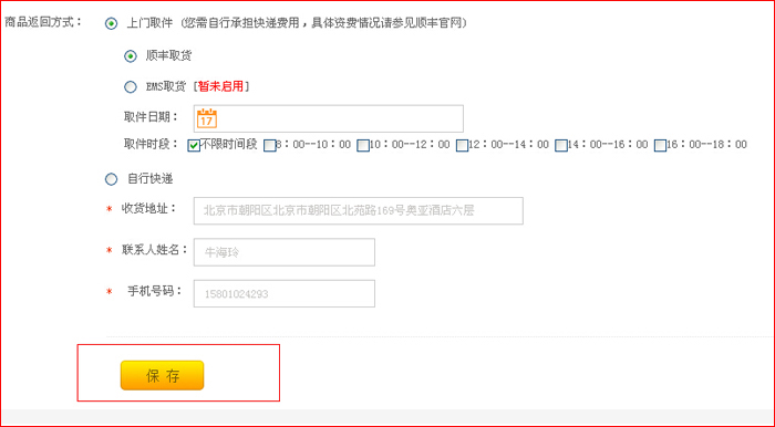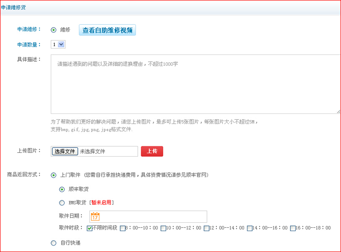 第三步:按要求填写退换货内容,如选择上门取货,可选择快递上门取货时间,填写完毕后点”提交“按钮,在售后维修记录中查看详情;如选择自行邮寄,则需在审核通过,产品邮寄后将快递单号填写到后台。