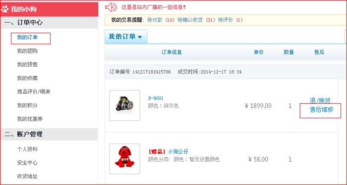 第二步:点击“我的订单”售后维修直接进入售后维修页面,或客户服务下“售后维修”,点击申请。